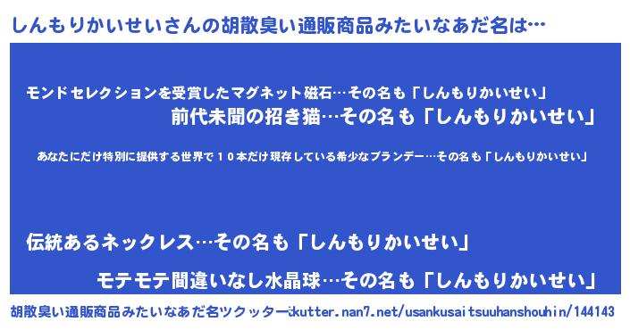 | 男性向けラノベタイトル風あだ名 | 『この素晴らしい世界にしんもりかいせいを!』 |
