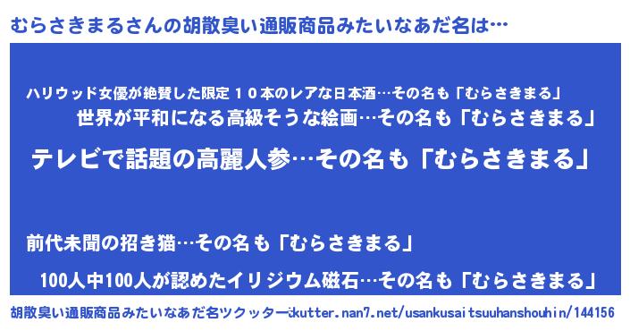 | 男性向けラノベタイトル風あだ名 | 『Re:むらさきまるから始める異世界生活』 |