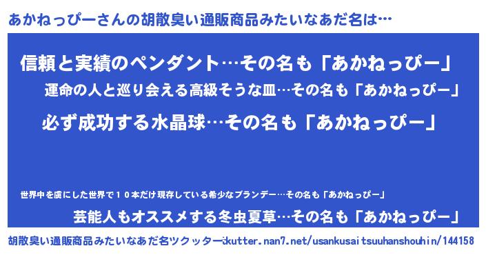 | 男性向けラノベタイトル風あだ名 | 『アカネッピースレイヤー』 |
