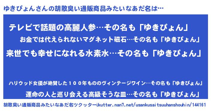 | 男性向けラノベタイトル風あだ名 | 『ゆきぴょんという概念が存在しない退屈な世界 』 |