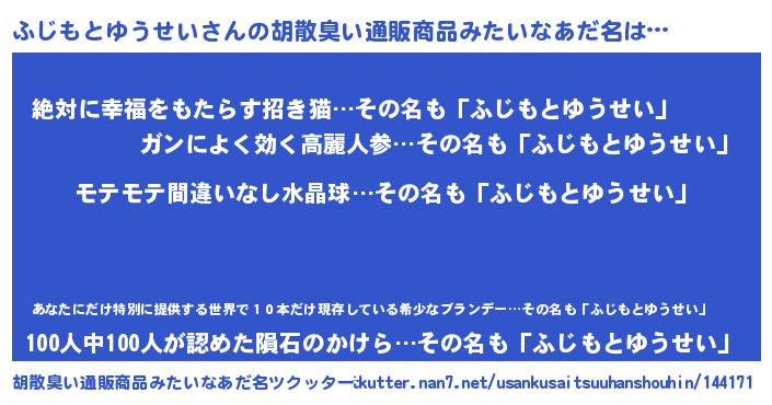 | ヘコむあだ名 | 『ふじにゅー』『ふじもとゆうせい(震え声)』 |