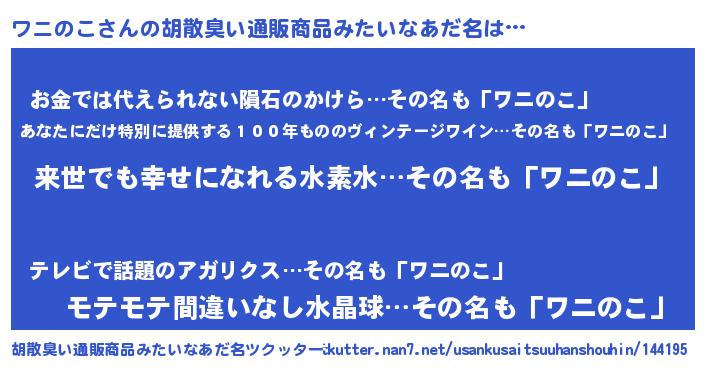 | 意味不明あだ名 | 『永久保存ワニのこ』『ペロリンワニのこ』 |