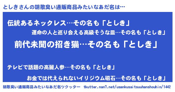 | 意味不明あだ名 | 『永久保存としき』『たけのこ科としき属』 |