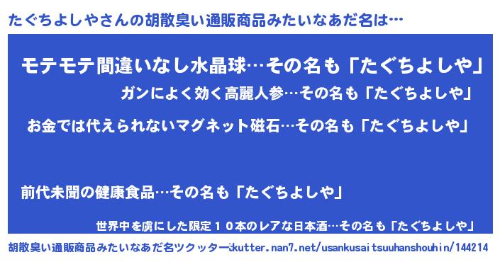 | ヘコむあだ名 | 『たぐふぇ~』『たぐちよしや(爆)』 |