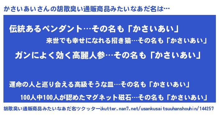 | 意味不明あだ名 | 『自称かさいあい』『永久保存かさいあい』 |