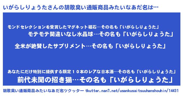 | 男性向けラノベタイトル風あだ名 | 『いがらしりょうたに滅ぼされるだけの簡単なお仕事です』 |