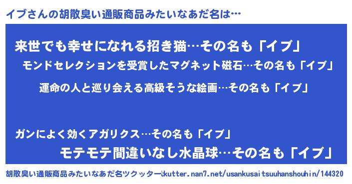 | 男性向けラノベタイトル風あだ名 | 『うちのイブが世界を掌握している!』 |
