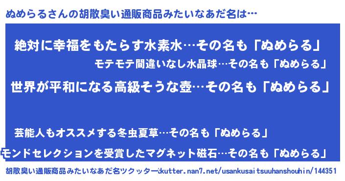 | 男性向けラノベタイトル風あだ名 | 『やはりぬめらるの青春ラブコメはまちがっている 』 |