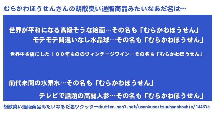 | 意味不明あだ名 | 『住所不定無職むらかわほうせん(12歳)』 |