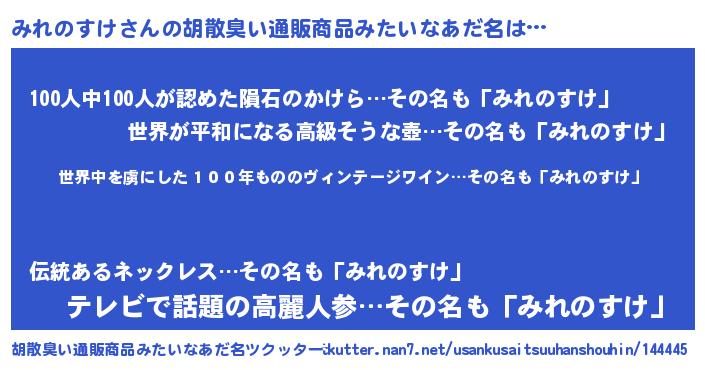 | 男性向けラノベタイトル風あだ名 | 『この素晴らしい世界にみれのすけを!』 |