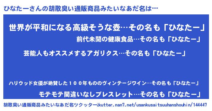 | 男性向けラノベタイトル風あだ名 | 『Re:ひなたーから始める異世界生活』 |