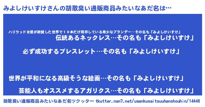 | 欧米人風あだ名 | 『アンジェラ・みよしけいすけ』 |