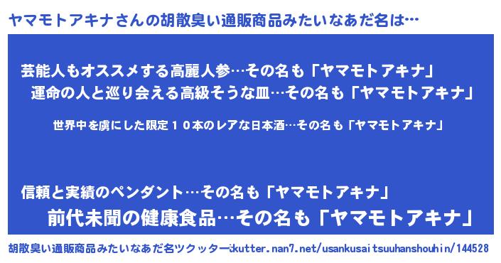| 男性向けラノベタイトル風あだ名 | 『転生したらヤマモトアキナだった件』 |