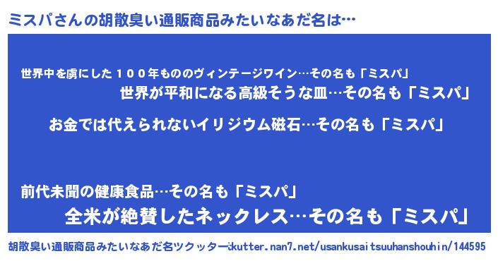 | ヘコむあだ名 | 『ミスっぺ』『豆乳』『ミスもー』 |