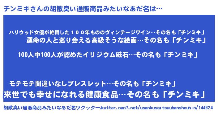 | 男性向けラノベタイトル風あだ名 | 『おまえをオタクにしてやるから、俺をチンミキにしてくれ! 』 |