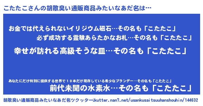 | 男性向けラノベタイトル風あだ名 | 『コタタコスレイヤー』『緋弾のコタタコ』 |