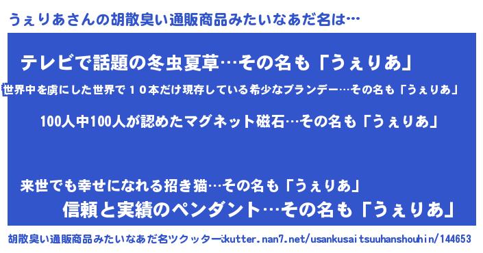 | ヒーロー風カッコイイあだ名 | 『正義の使者うぇりあ』『暗黒騎士ウェ』 |