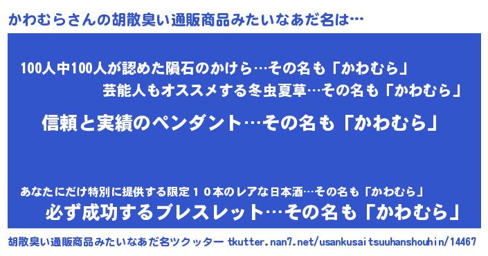 | ポケモン風あだ名 | 『カワキング』『ヒカワムラ』 |