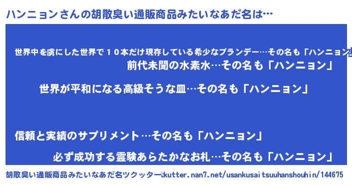 | 男性向けラノベタイトル風あだ名 | 『転生したらハンニョンだった件』 |