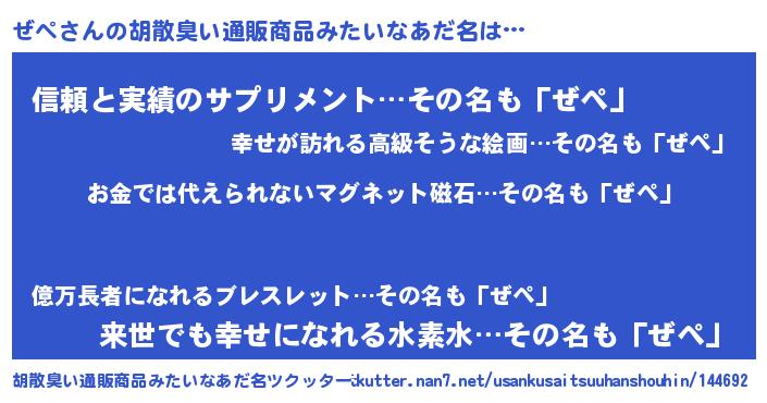| ヒーロー風カッコイイあだ名 | 『慈愛の使者ぜペ』『魔戒騎士ゼペ』 |