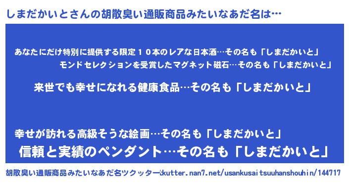 | ヘコむあだ名 | 『しまだかいと(爆)』『しまっ子』 |