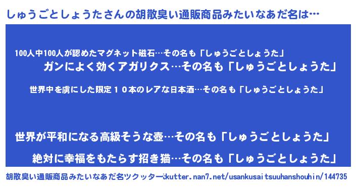 | 意味不明あだ名 | 『住所不定無職しゅうごとしょうた(50歳)』 |