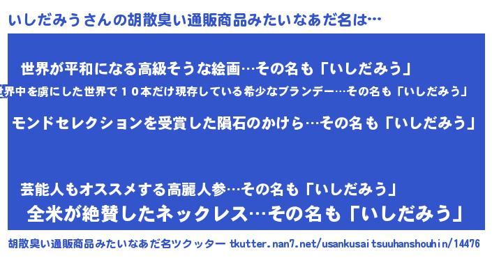 | 男性向けラノベタイトル風あだ名 | 『ノーゲーム・ノーイシダミウ』 |