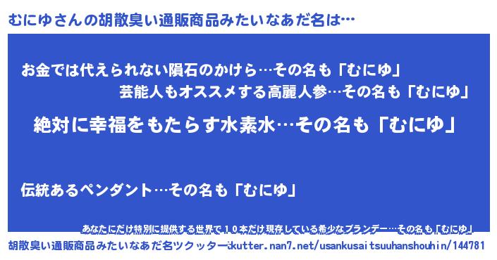 | 男性向けラノベタイトル風あだ名 | 『ムニユスレイヤー』『魔弾の王とむにゆ』 |