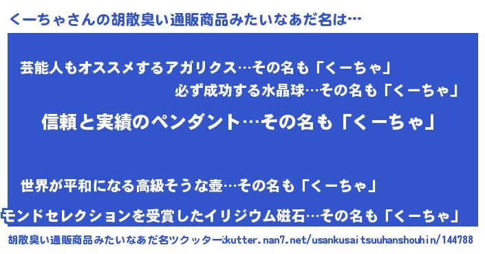 | ヘコむあだ名 | 『くーぷりん』『くーにゅー』 |