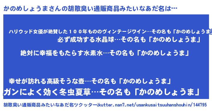 | 男性向けラノベタイトル風あだ名 | 『かのめしょうまという概念が存在しない退屈な世界 』 |