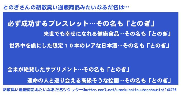 | 意味不明あだ名 | 『住所不定無職とのぎ(53歳)』 |