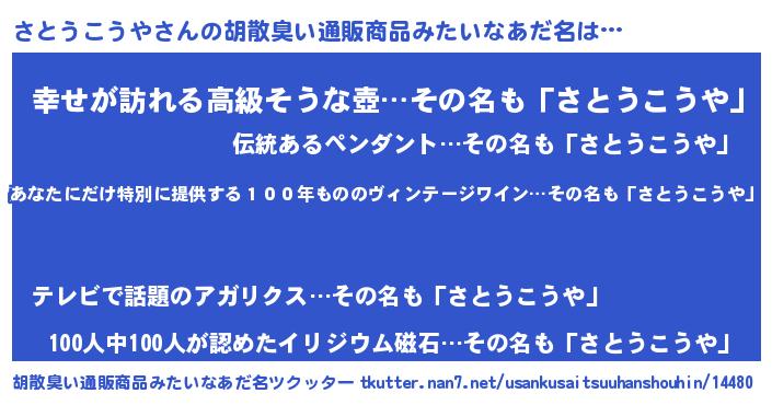 | 男性向けラノベタイトル風あだ名 | 『うちのさとうこうやが世界を掌握している!』 |
