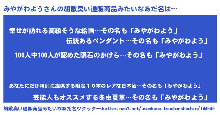 | 男性向けラノベタイトル風あだ名 | 『おまえをオタクにしてやるから、俺をみやがわようにしてくれ! 』 |