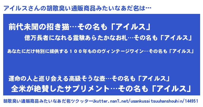 | 男性向けラノベタイトル風あだ名 | 『この素晴らしい世界にアイルスを!』 |