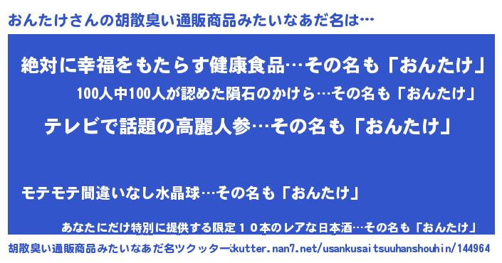| 男性向けラノベタイトル風あだ名 | 『Re:おんたけから始める異世界生活』 |