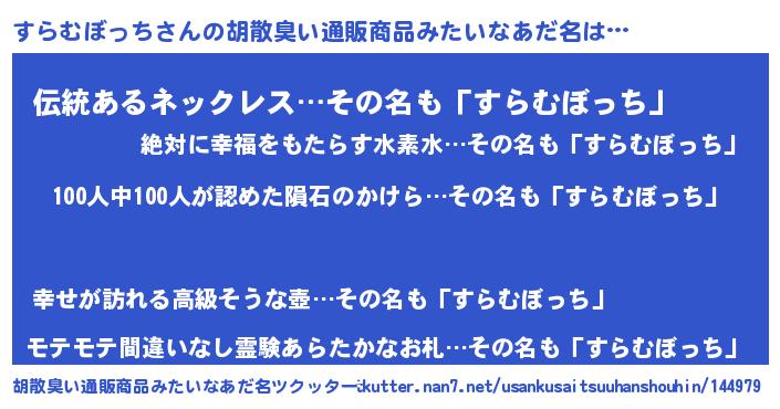 | 欧米人風あだ名 | 『アンジェラ・すらむぼっち』 |