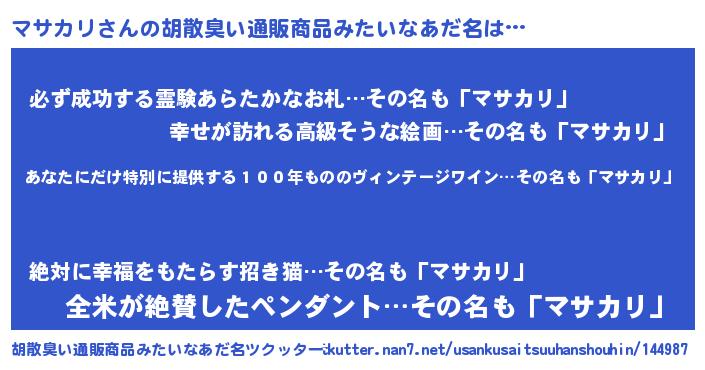 | 男性向けラノベタイトル風あだ名 | 『マサカリ~年齢イコール彼女いない歴の魔法使い~』 |