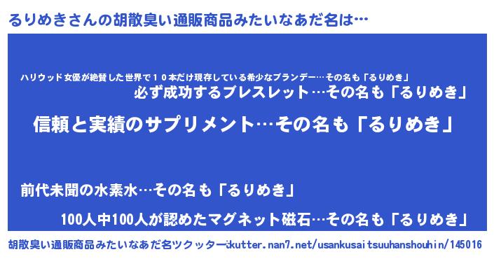 | 意味不明あだ名 | 『とにかく怪しいるりめき』 |