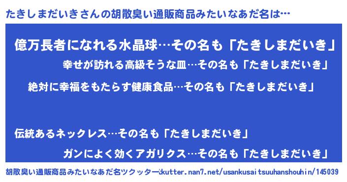 | ヘコむあだ名 | 『たきしまだいき(爆)』『たきにゅー』 |
