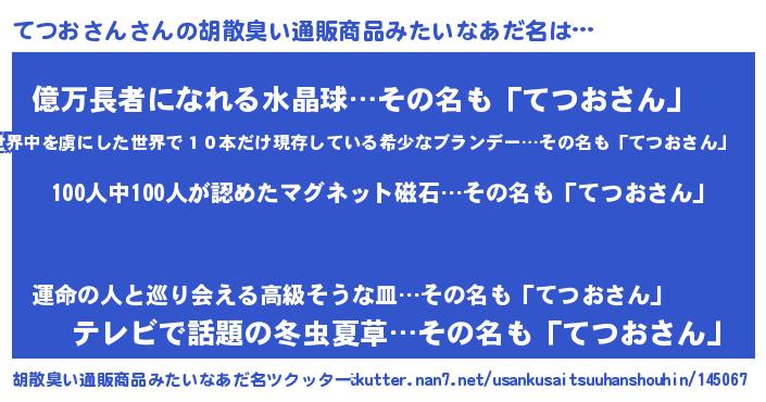 | 男性向けラノベタイトル風あだ名 | 『おまえをオタクにしてやるから、俺をてつおさんにしてくれ! 』 |