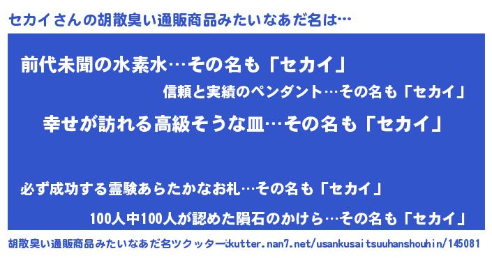 | ヒーロー風カッコイイあだ名 | 『ウルトラセカイマン』『ネオセカイ』 |