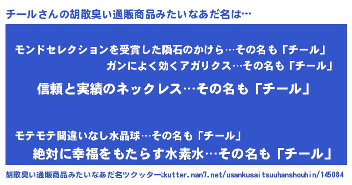 | 意味不明あだ名 | 『とにかく怪しいチール』『自称チール』 |