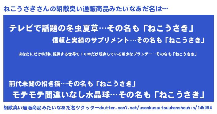 | 意味不明あだ名 | 『住所不定無職ねこうさき(81歳)』 |