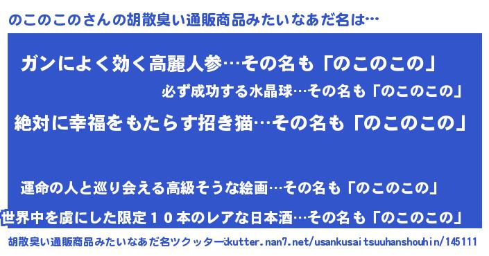 | 男性向けラノベタイトル風あだ名 | 『のこのこのという概念が存在しない退屈な世界 』 |