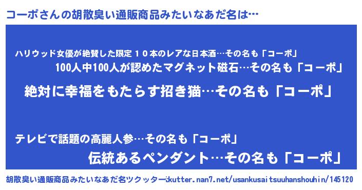 | 男性向けラノベタイトル風あだ名 | 『コーポという概念が存在しない退屈な世界 』 |