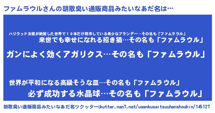 | ヘコむあだ名 | 『ファにゅー』『ファムラウル(爆)』 |