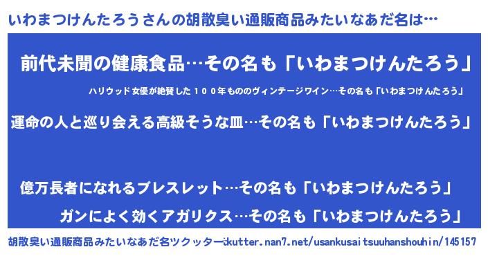 | 男性向けラノベタイトル風あだ名 | 『うちのいわまつけんたろうが世界を掌握している!』 |