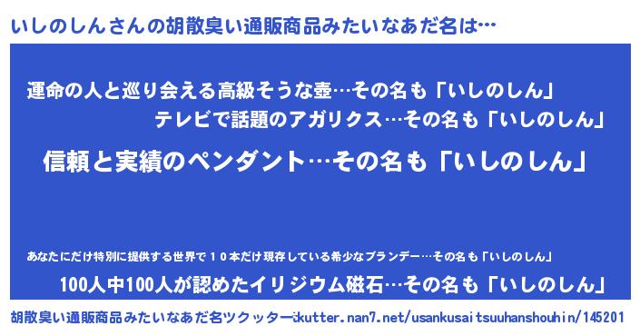 | ヒーロー風カッコイイあだ名 | 『黄金騎士イシ』『慈愛の使者いしのしん』 |