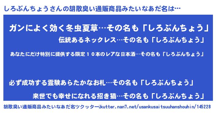 | 男性向けラノベタイトル風あだ名 | 『しろぶんちょう~年齢イコール彼女いない歴の魔法使い~』 |