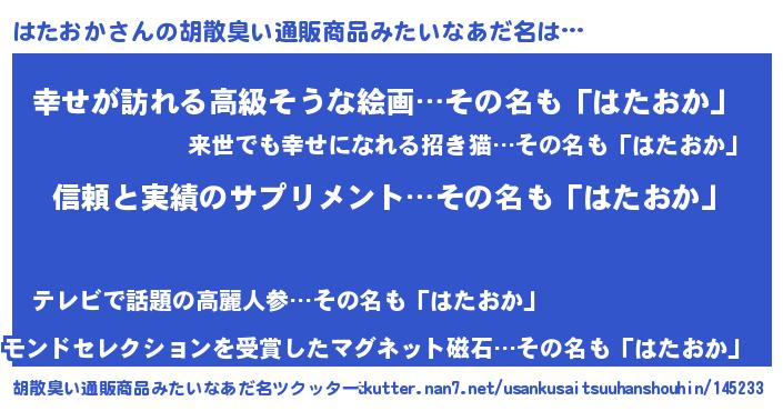 | 男性向けラノベタイトル風あだ名 | 『ハタオカスレイヤー』 |